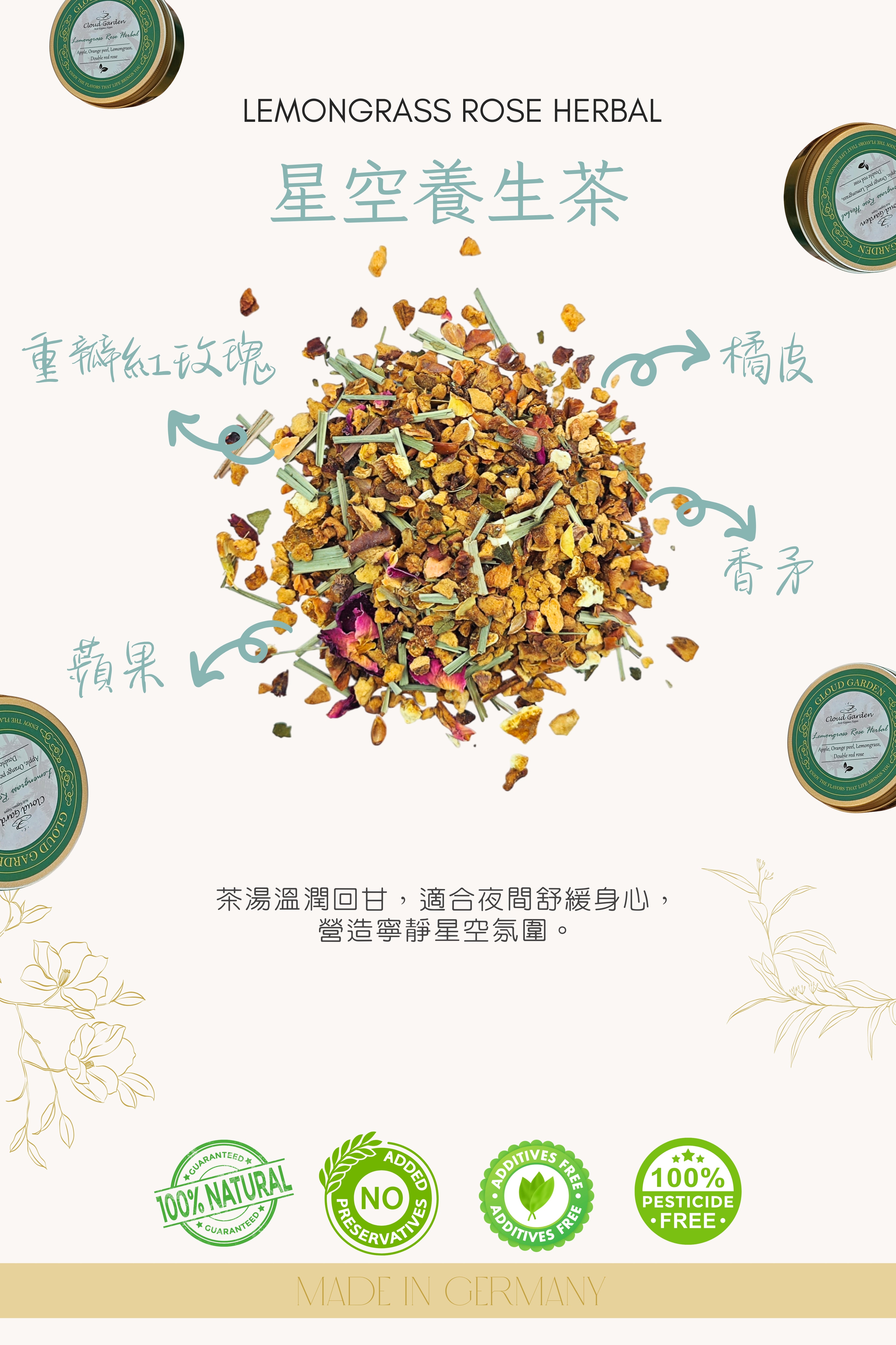 [Digestion Aid • Rose Radiance] This caffeine-free, nourishing tea features apple and orange peel to aid digestion, while rose nourishes from within for a naturally radiant complexion. This herbal beverage combines a variety of natural ingredients to promote physical and mental well-being. Its refreshing aroma and smooth taste offer a sense of tranquility and relaxation, like gazing at the stars. Perfect for finding a moment of peace amidst a busy life.