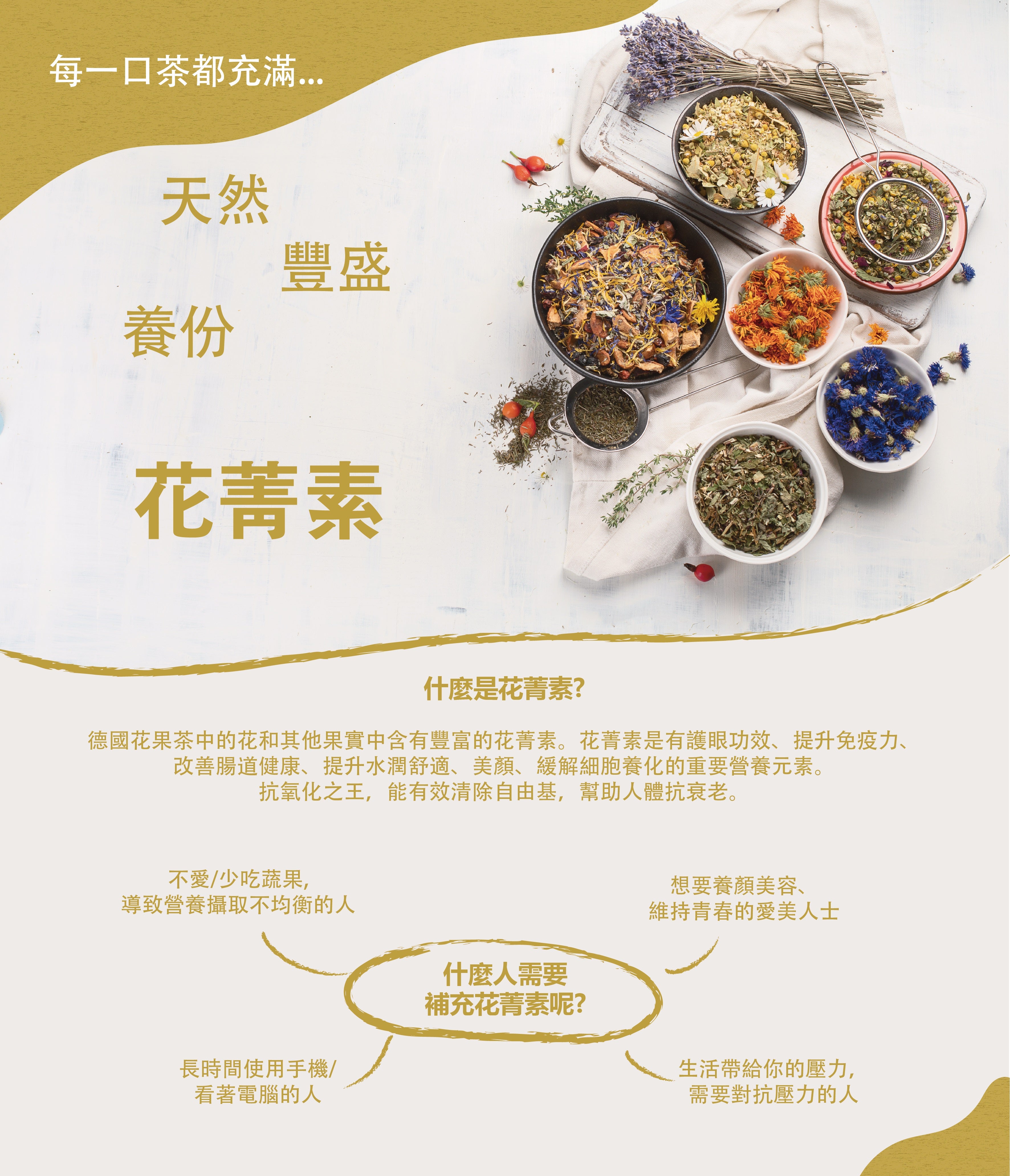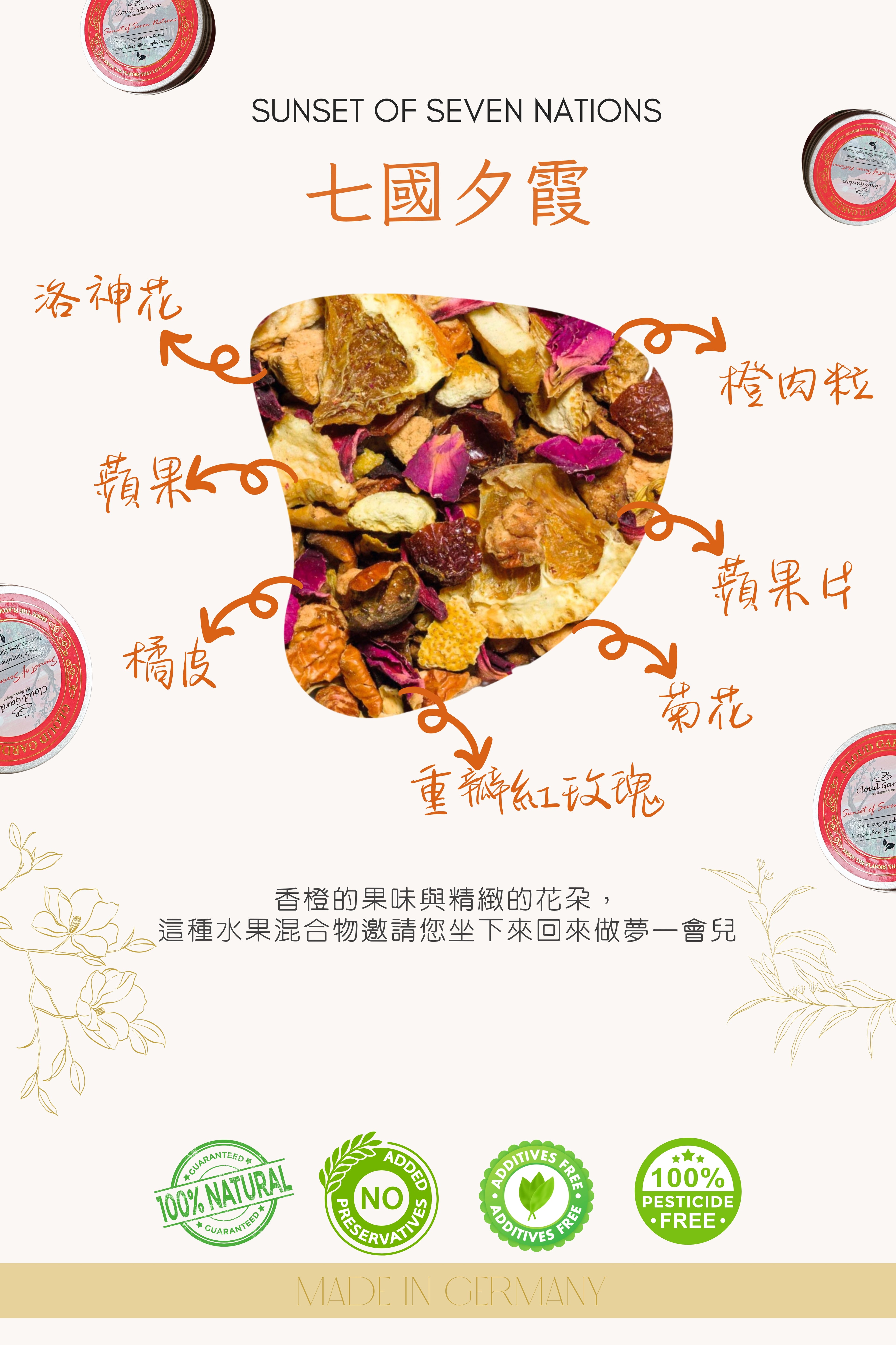 【富含維生素C • 美容抗氧化】洛神花與玫瑰和香橙,富含天然維生素C與花菁素等抗氧化物,從內在滋養肌膚,幫助對抗自由基,養出自然紅潤的好氣色。香橙的果味與精緻的花朵,這種水果混合物邀請您坐下來回來做夢一會兒。