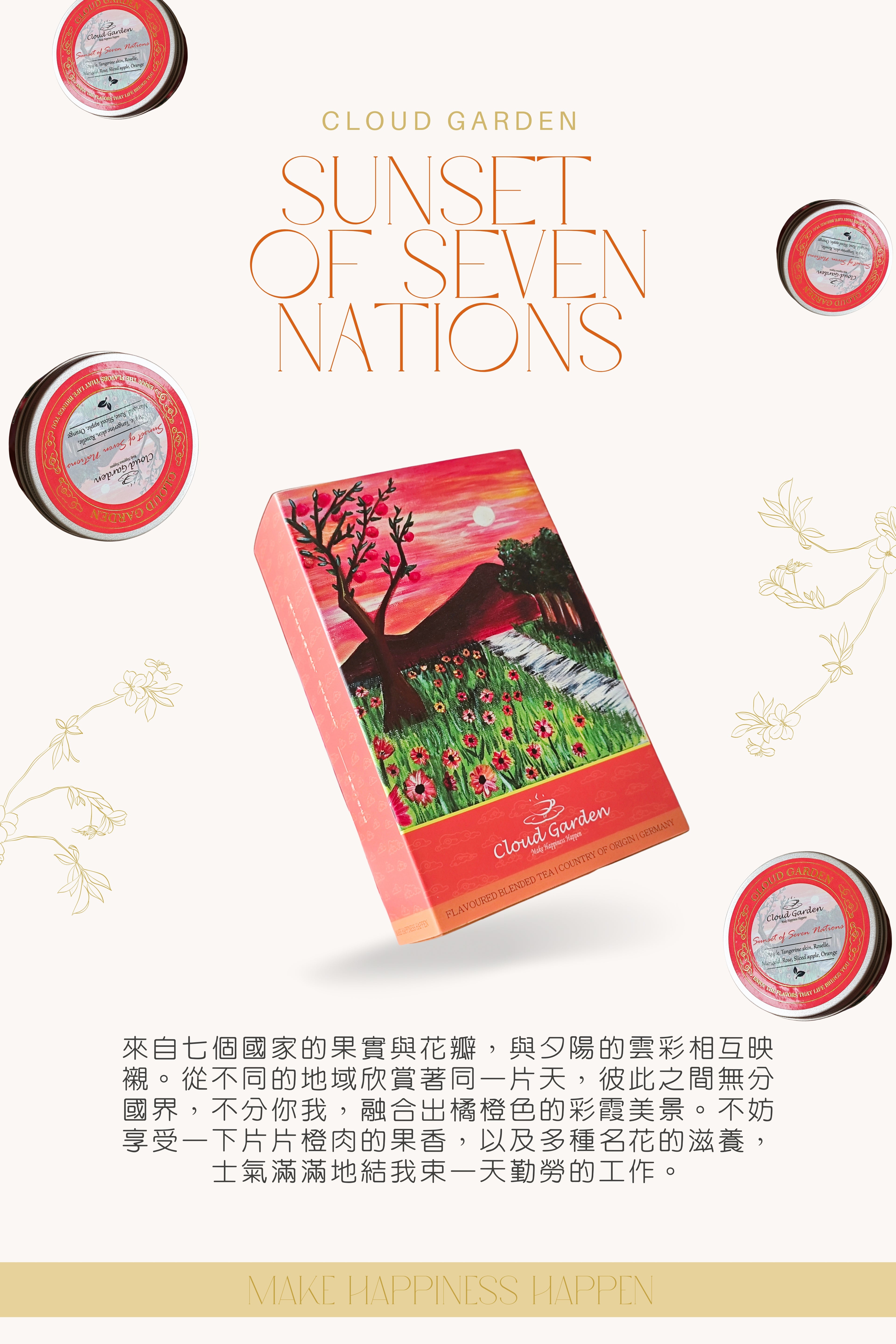 來自七個國家的果實與花瓣,與夕陽的雲彩相互映襯。從不同的地域欣賞著同一片天,彼此之間無分國界,不分你我,融合出橘橙色的彩霞美景。不妨享受一下片片橙肉的果香,以及多種名花的滋養,士氣滿滿地結我束一天勤勞的工作。