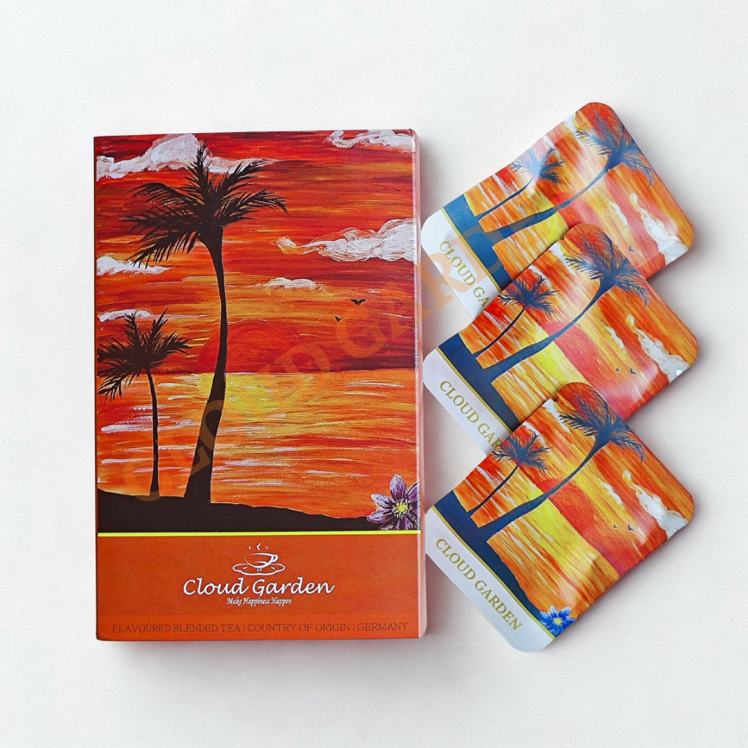 在海邊的沙灘上,捧著一杯椰香百香果風味白茶,